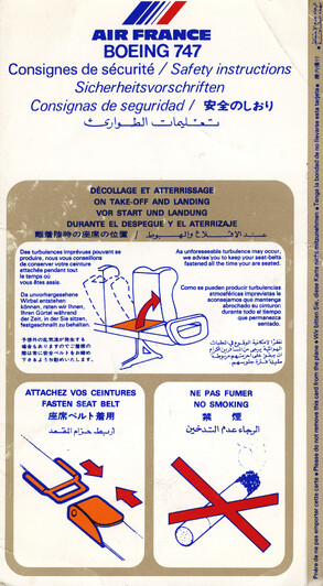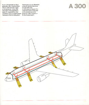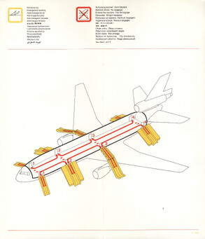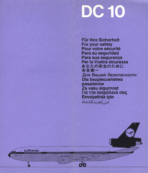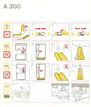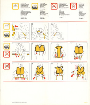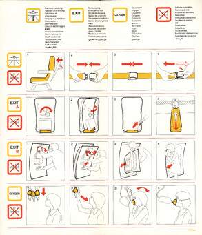 Airline-Safety-Manuals oder Safety-Cards, die in Flugzeugen in der Sitztasche bereitliegen, sind speziell dafür gestaltet, sicherheitsrelevante Informationen klar und schnell verständlich zu vermitteln. Ihr Design ist bewusst reduziert, mit hoher Farbkontrastierung und übersichtlicher Struktur, damit Passagiere auch unter Stress rasch die wichtigsten Hinweise finden. Texte sind knapp gehalten und in einfacher Sprache formuliert, häufig mehrsprachig oder ganz ohne Fließtext.