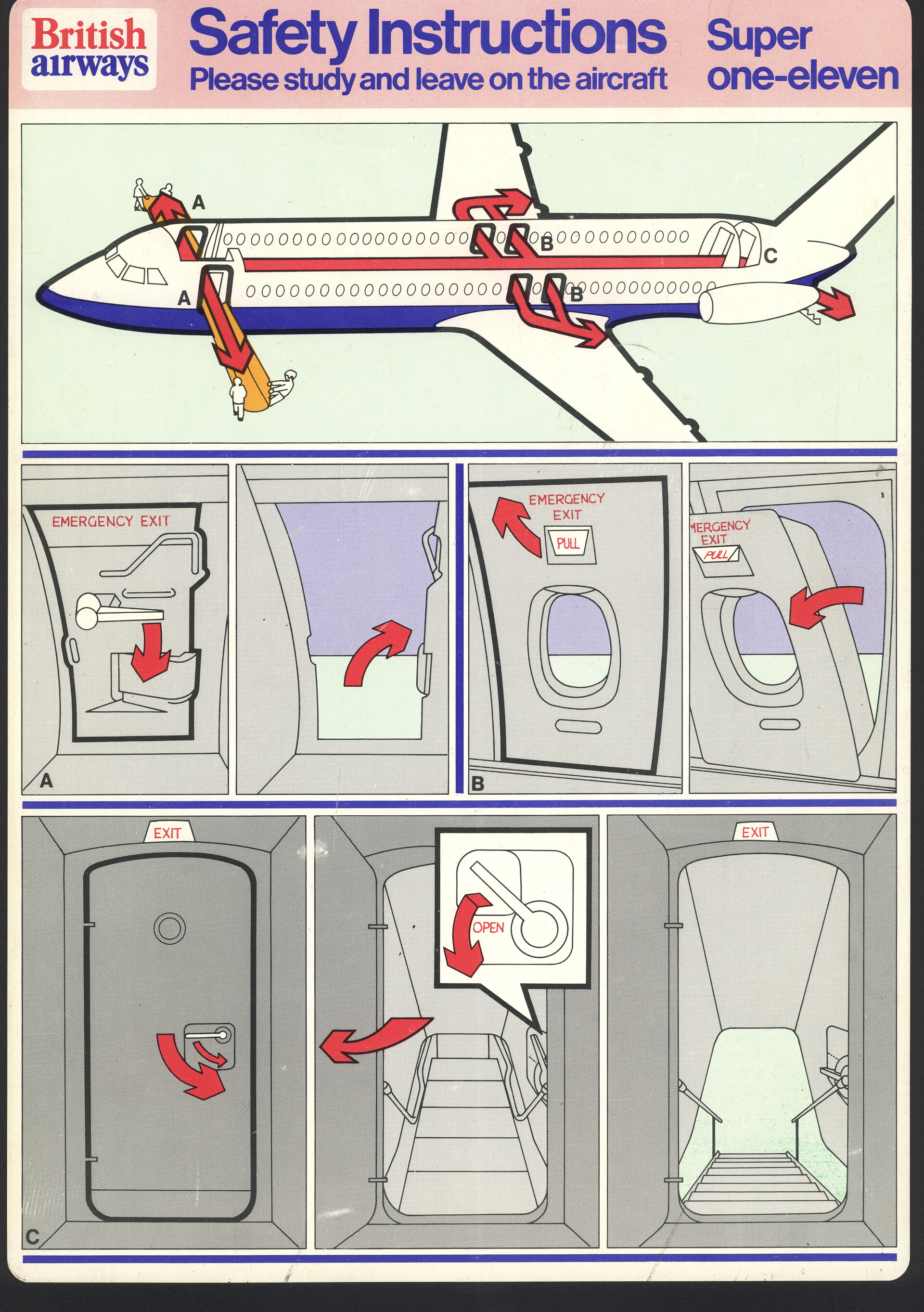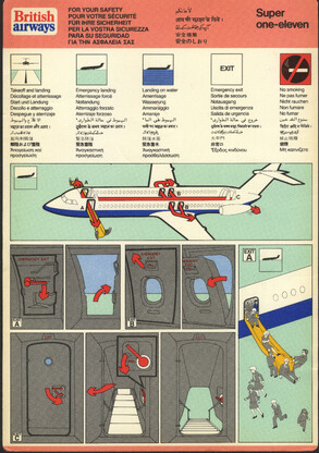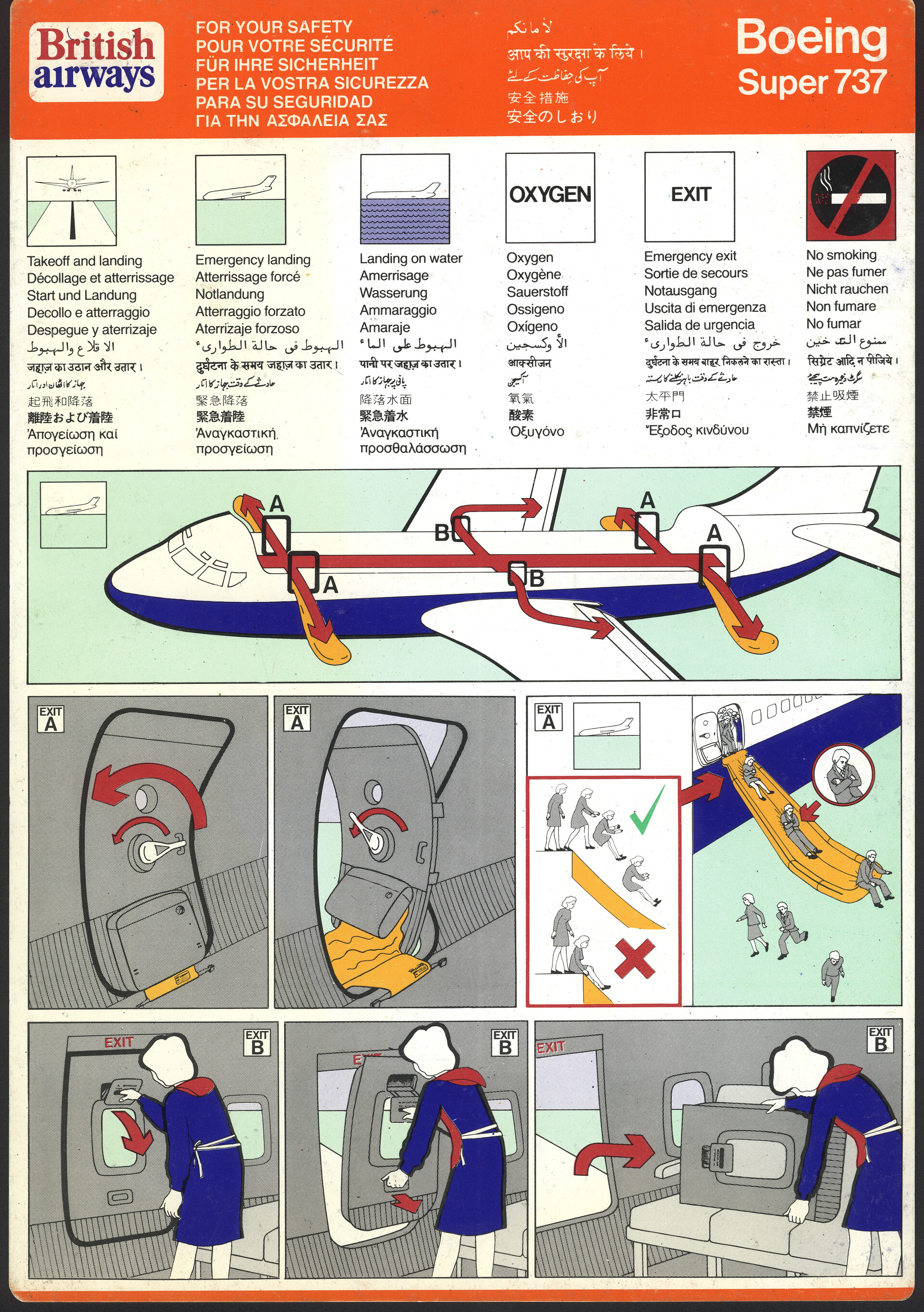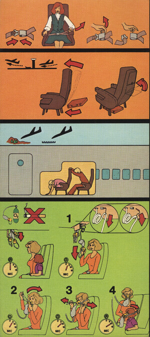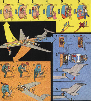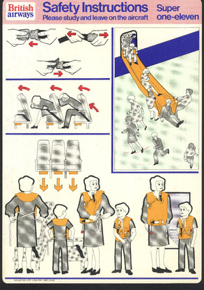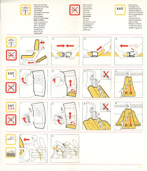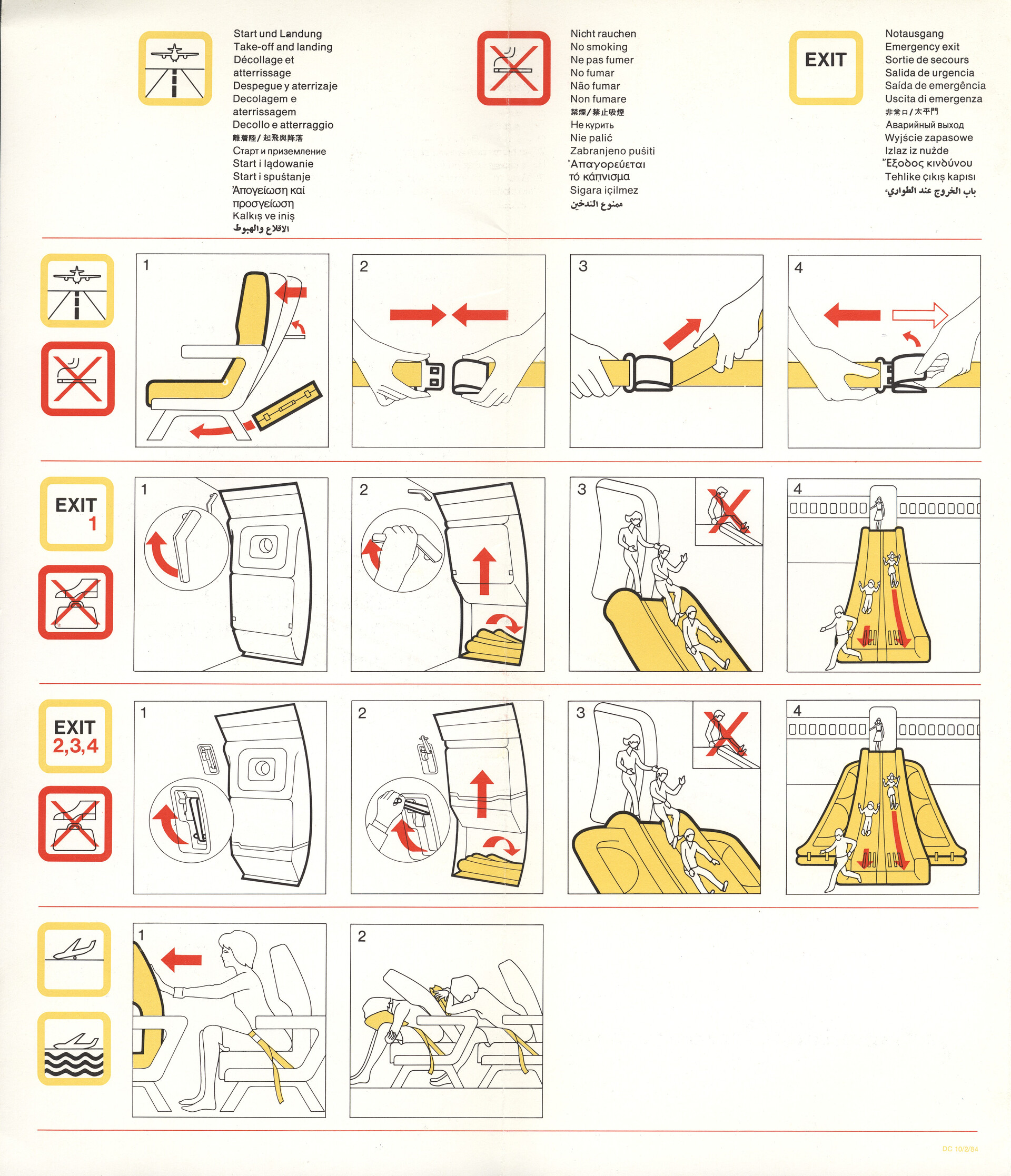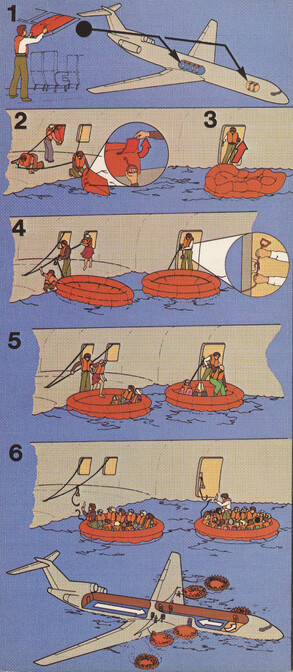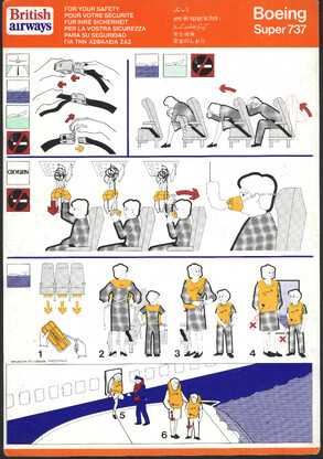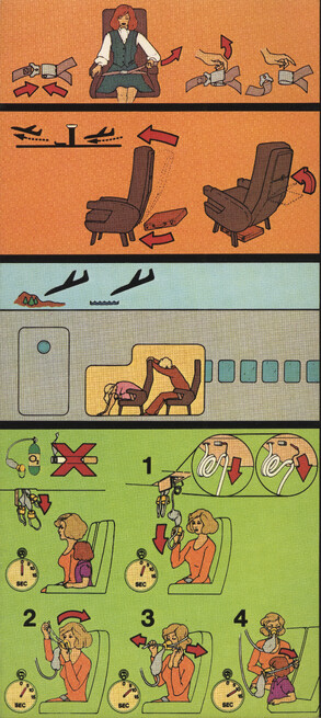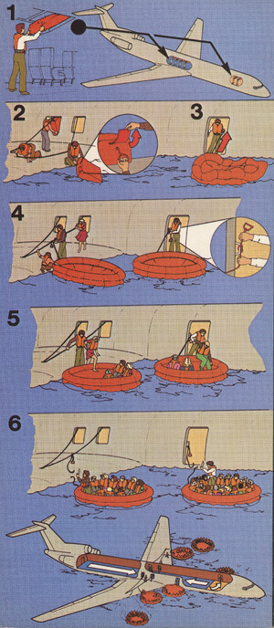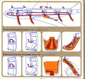 »Welcome onboard our SuperOneEleven, ...« Infografik vom Feinsten. Hübsche Puppen springen aus dem Fenster, gleiten auf Plastikrutschen. Alles zu unseren Sicherheit. Immer wieder lesen!