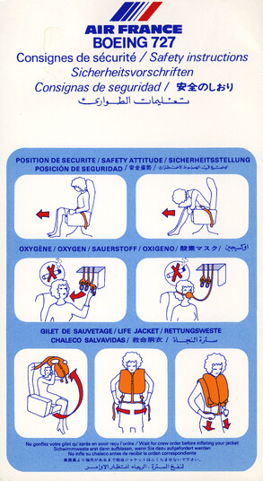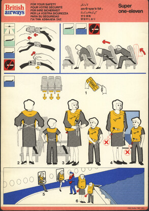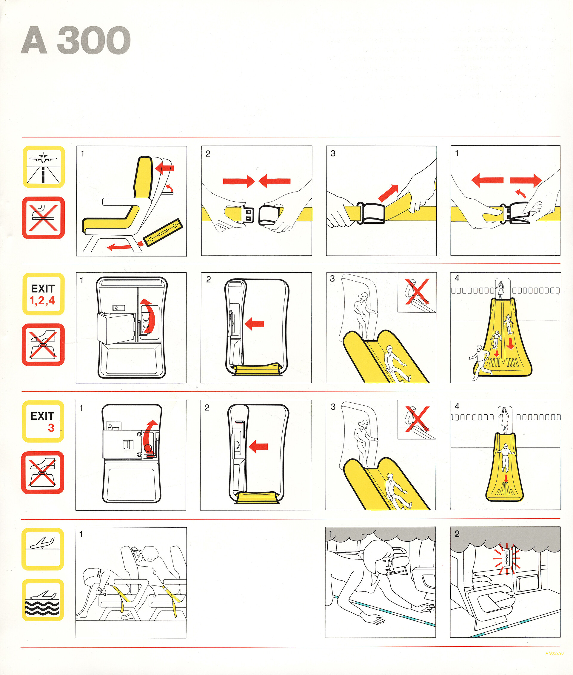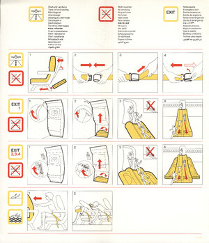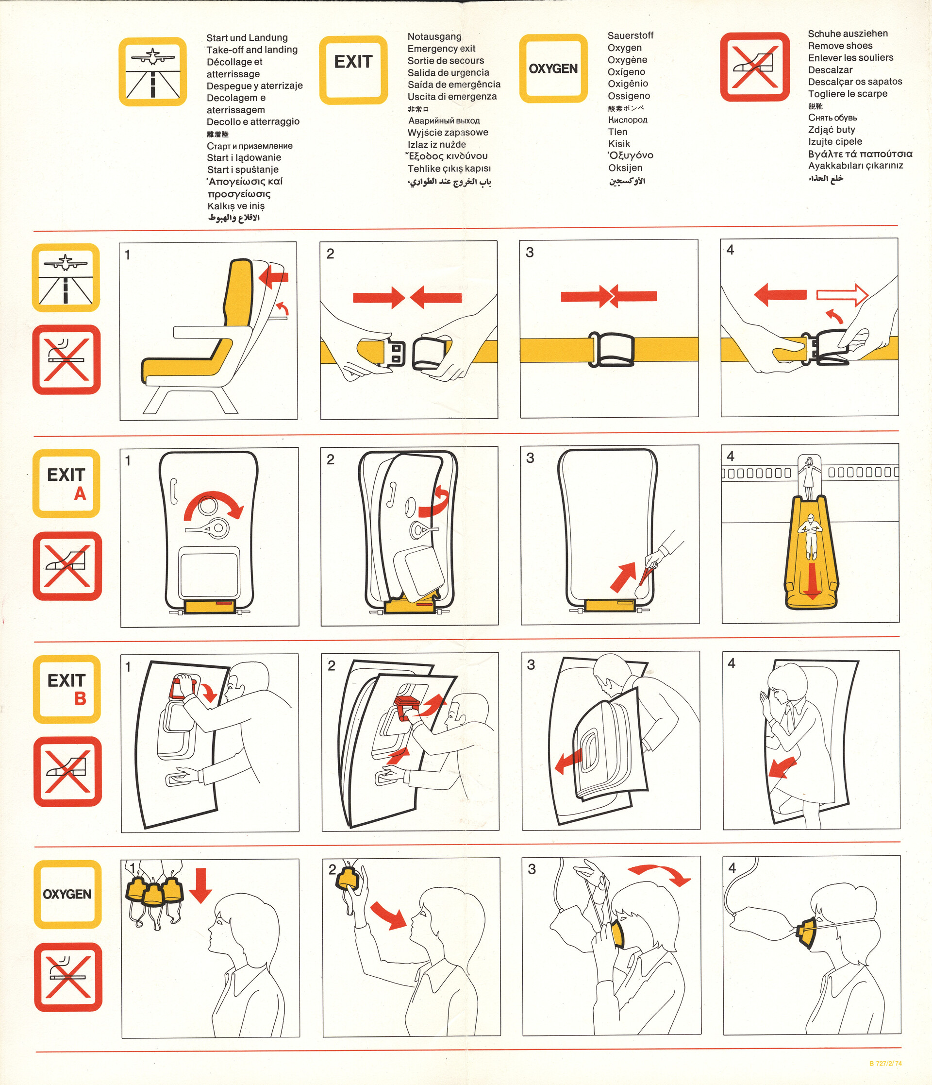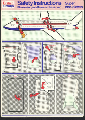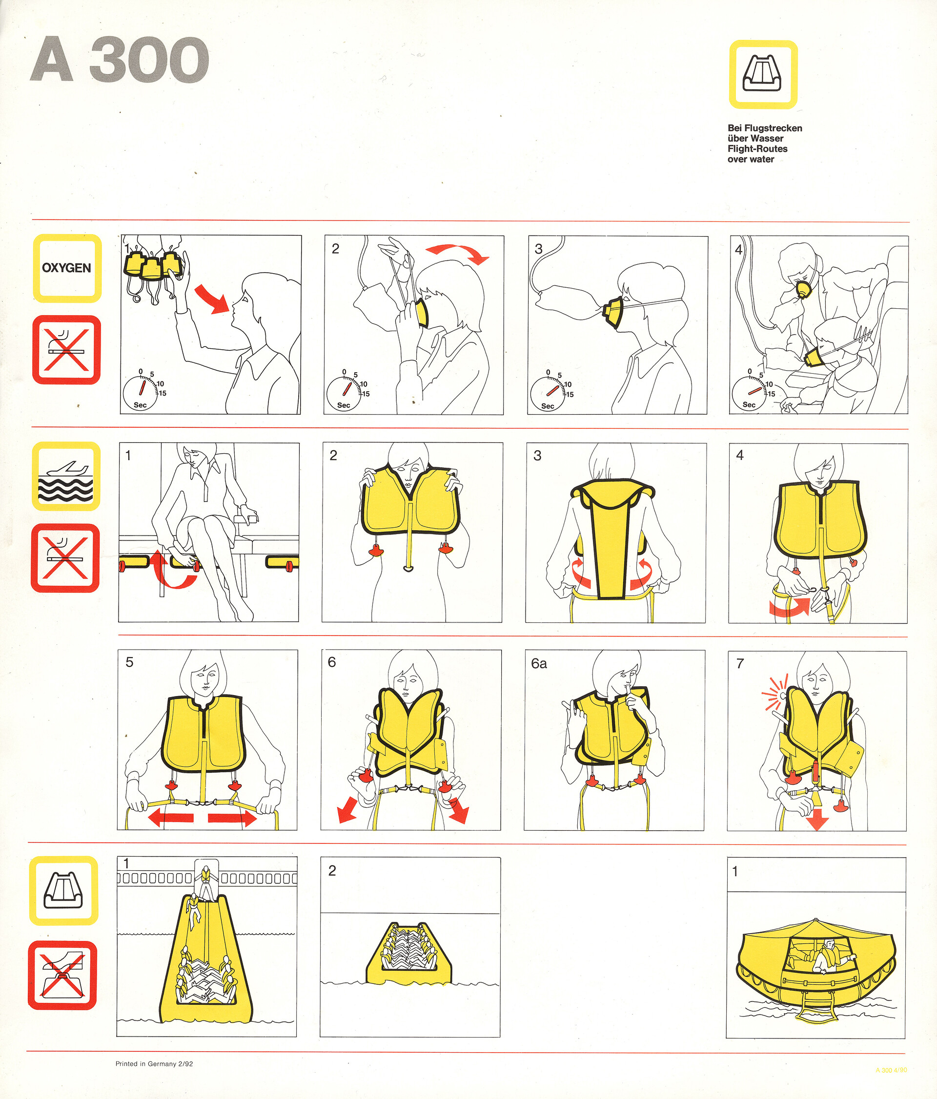 »Welcome onboard our SuperOneEleven, ...« Infografik vom Feinsten. Hübsche Puppen springen aus dem Fenster, gleiten auf Plastikrutschen. Alles zu unseren Sicherheit. Immer wieder lesen!