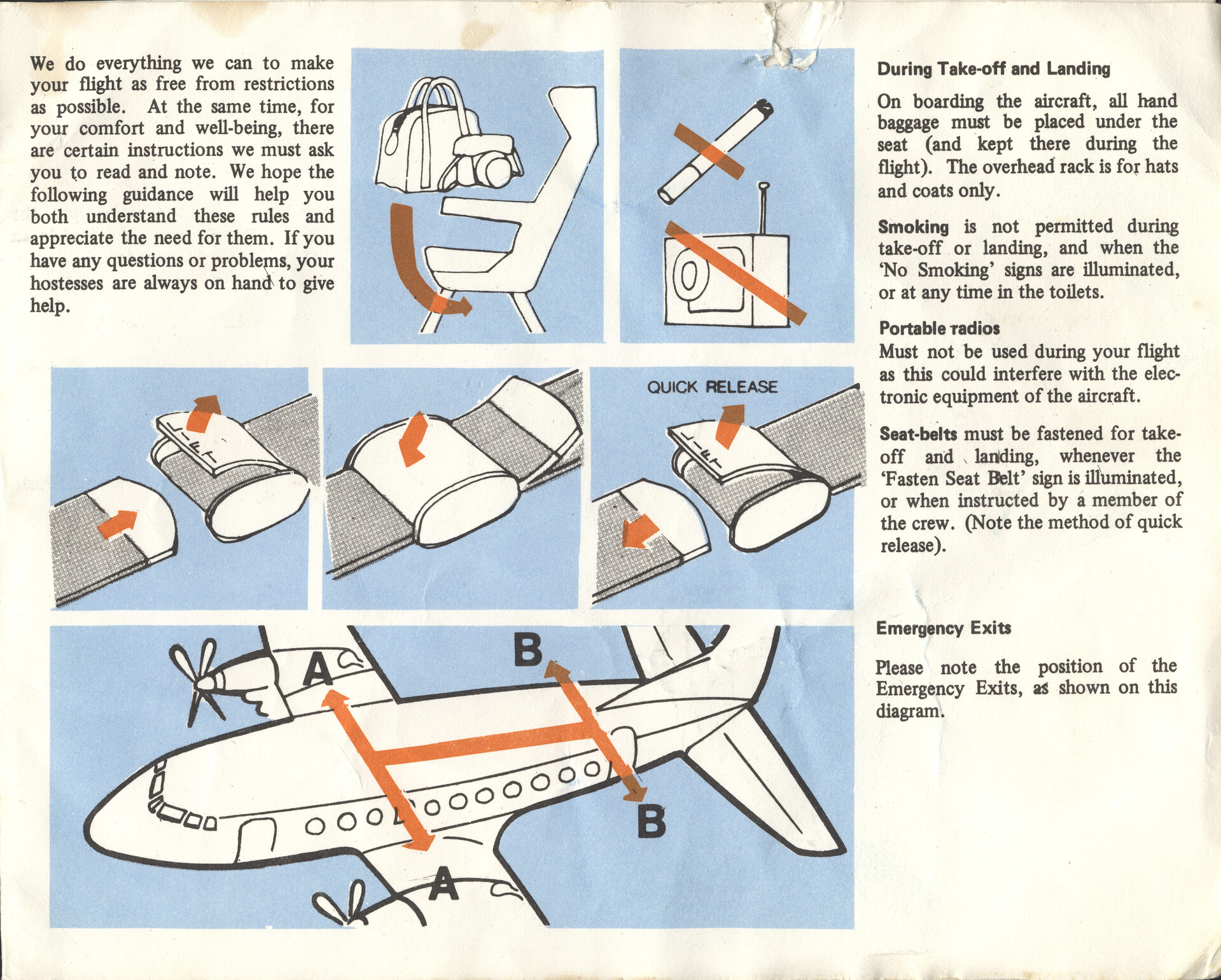 »Welcome onboard our SuperOneEleven, this morning on our regular service from Berlin to London Heathrow. Our flight time today will be one hour and 45 minutes. Please relax and enjoy your flight, while our cabin crew will serve you. Please take a minute to read the safety instructions.« –– unknown crew member