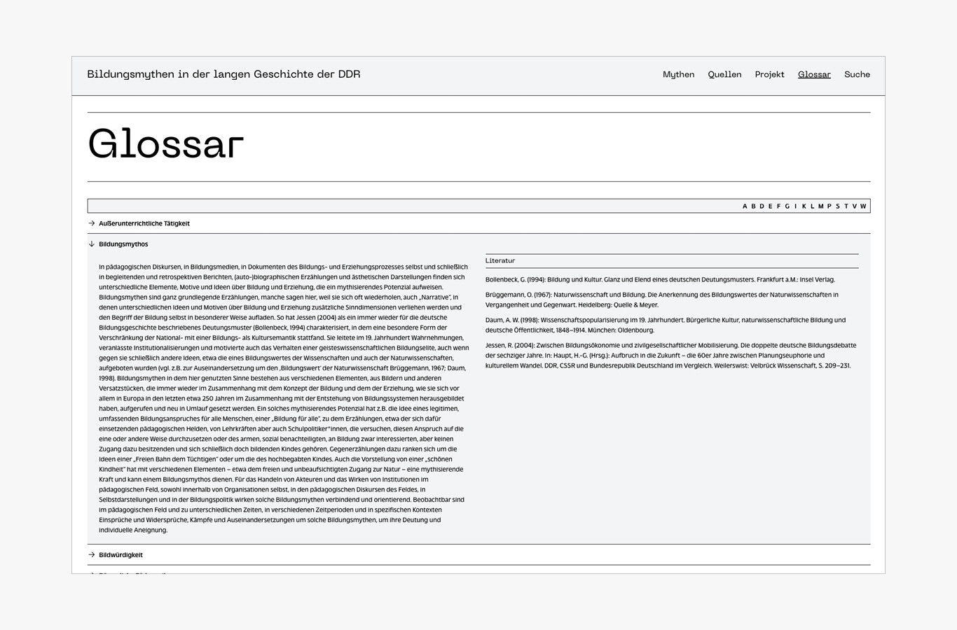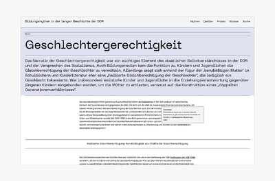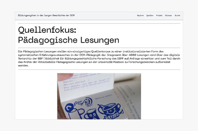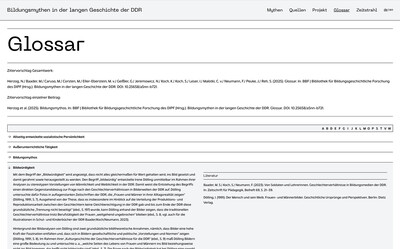Für die Website bildungsmythen-ddr.de wünschte sich die Bibliothek für Bildungsgeschichtliche Forschung des Leibniz-Instituts für Bildungsforschung und Bildungsinformation eine Reihe von Funktionen, die die Website sowohl für die breite Öffentlichkeit als auch für Wissenschaftler attraktiv machen sollten. Wir haben unter anderem ein Suchsystem nach Schlüsselwörtern und Autor*innen, ein automatisiertes Glossar, ein Fußnotensystem und eine Anbindung an eine Zotero-Bibliothek entwickelt, die das Herunterladen von Metadaten zu jedem Artikel ermöglicht.