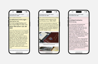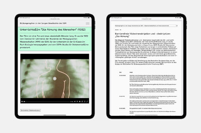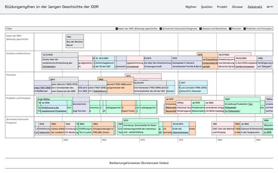 Eine weitere Anforderung an die Website bildungsmythen-ddr.de war, dass sie so barrierearm wie möglich sein sollte. Daher haben wir zum einen ein Design entwickelt, das sehr gut lesbar ist und einen starken Kontrast bietet. Die sechs Farben, die neben Schwarz verwendet werden, sind Pastelltöne, die einen sehr starken Kontrast zum Text bieten und deren Erkennung für das Verständnis des Inhalts nicht unbedingt erforderlich ist. Die Website ist so aufgebaut, dass sie bei Bedarf vergrößert und/oder mit einem Screenreader gelesen werden kann. Jedes Video verfügt über einschaltbare Untertitel und eine vollständige Transkription in Form einer barrierefreien PDF. Die Interviews, die im Rahmen der Forschungsprojekte geführt wurden, sind ebenfalls als barrierefreie PDF verfügbar.