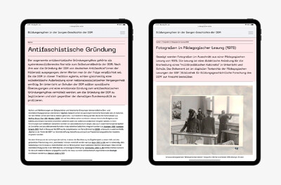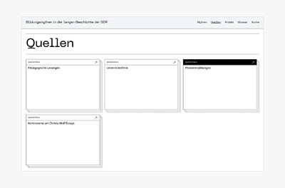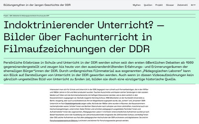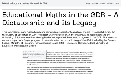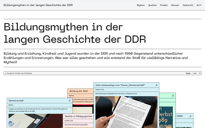 Die BBF | Bibliothek für Bildungsgeschichtliche Forschung des DIPF | Leibniz-Institut für Bildungsforschung und Bildungsinformation beauftragte uns mit der Erstellung einer Website, die dem Wissenstransfer des Verbundforschungsprojekts »Bildungsmythen über die DDR – eine Diktatur und ihr Nachleben« dient. Die Forschungsprojekte von BBF und drei Universitäten erforschen und hinterfragen sechs Mythen über das Bildungssystem der DDR.