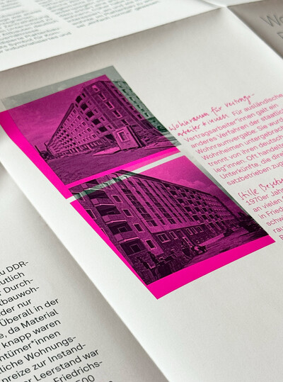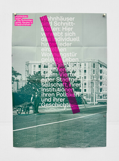 Das Broschüren-Plakat »Plattenbau lesen« öffnet ein Fenster in die Marchlewskistraße in Friedrichshain. 1984 eingeweiht, schwärmte eine Erstbewohnerin: „Ein Traum. Warmwasser, Zentralheizung.“ Doch hinter jeder Wohnungstür schlummern Geschichten – vom Alltag, von Nachbarschaften, vom Puls der Stadtgesellschaft.