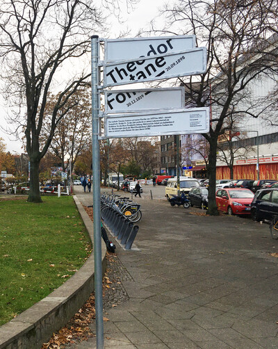 Erinnerung an Fontane. Ein Beispiel ist das Gedenkzeichen für Theodor Fontane. In der Tempelhofer Straße 51 – heute Amerika-Gedenkbibliothek – lebte und arbeitete er, zwischen Kerzenlicht und Zeitungspapier. Wir kombinierten Alurahmen und Straßenschilder-Typografie, doch statt Straßennamen finden sich Orte der Mark Brandenburg aus seinem Werk.