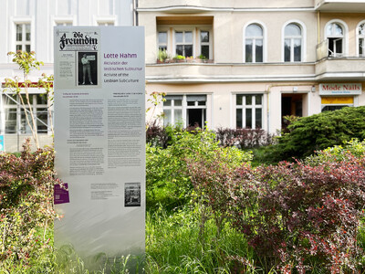 Eine weitere Stele ehrt Charlotte Hedwig „Lotte“ Hahm, die in der Weimarer Republik Treffpunkte für Lesben und Trans*-Personen schuf, mutig und beharrlich in einer Zeit, die ihre Subkultur bedrohte. Ihre Arbeit vernetzte, stärkte und gab Raum – selbst im Schatten des Nationalsozialismus gelang es ihr, Begegnungen zu ermöglichen, die Hoffnung und Widerstand zugleich waren.