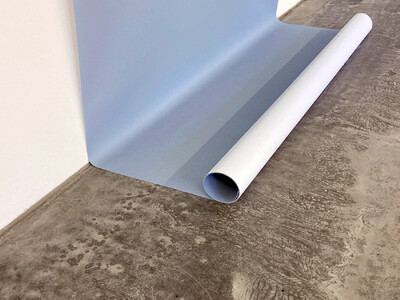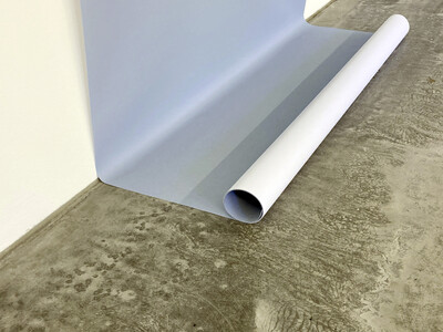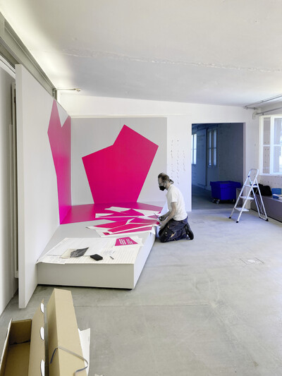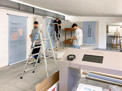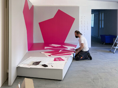 Mit den bis auf den Boden ausgerollten Grafikbahnen unterstreichen wir den Werkstattcharakter der Intervention.